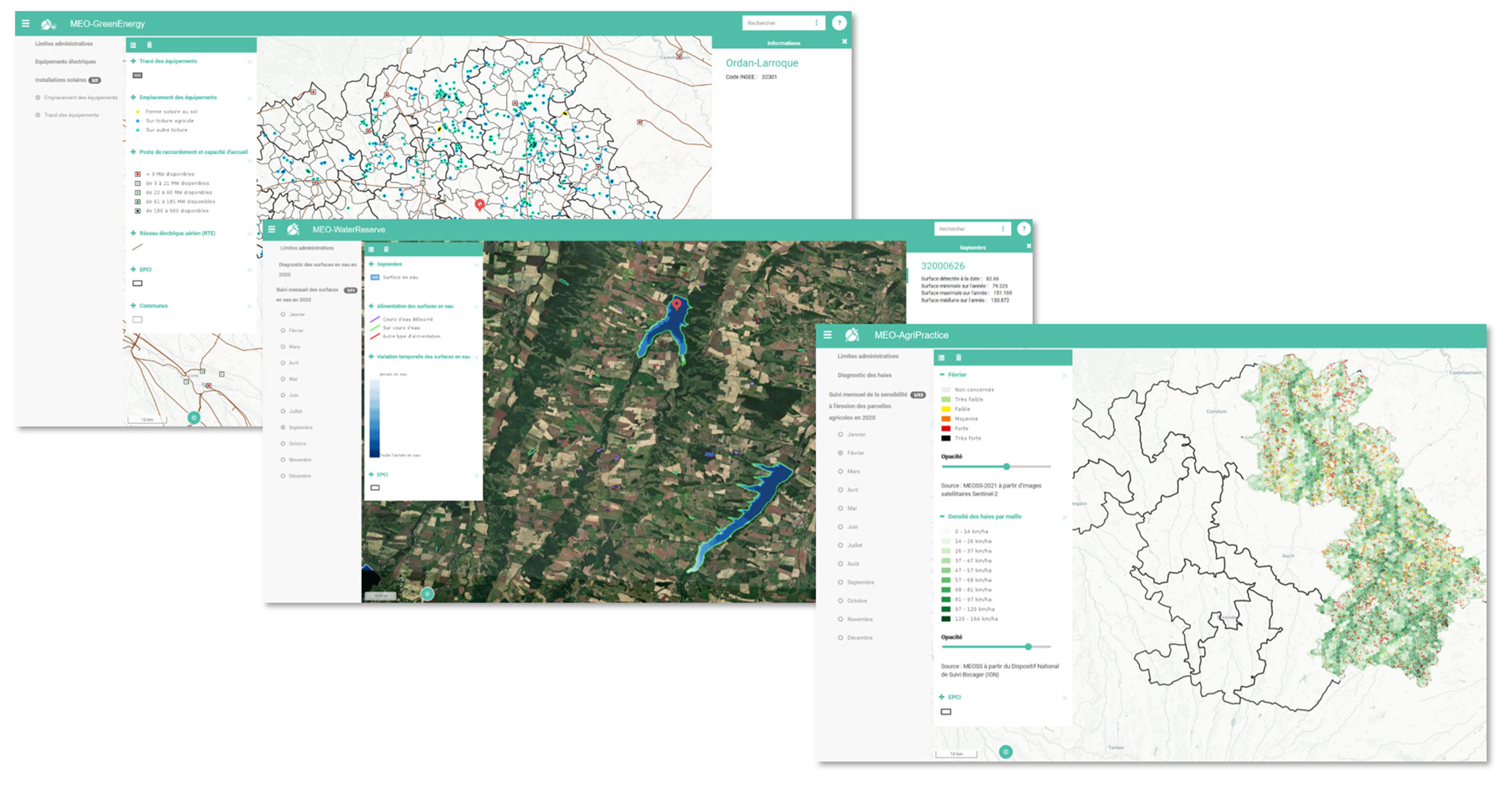 Based on regular cartographic data, MEO-Climate provides three decision-making tools to support the local management of actions related to the PCAET and the SCoT. They aim to identify the spatial and temporal evolution of water surfaces, the risks of erosion of agricultural plots and the equipment dedicated to solar energy production.
