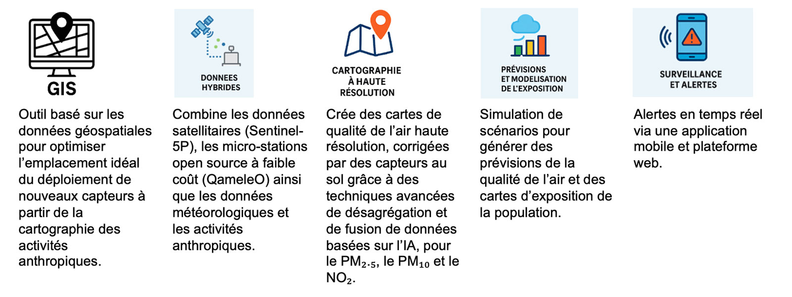 - Une plateforme d’agrégation des données environnementales, terrestres et satellitaires, et données de santé générant des cartes de la qualité de l’air et des indicateurs spatialisés de pollution et de risque sanitaire.