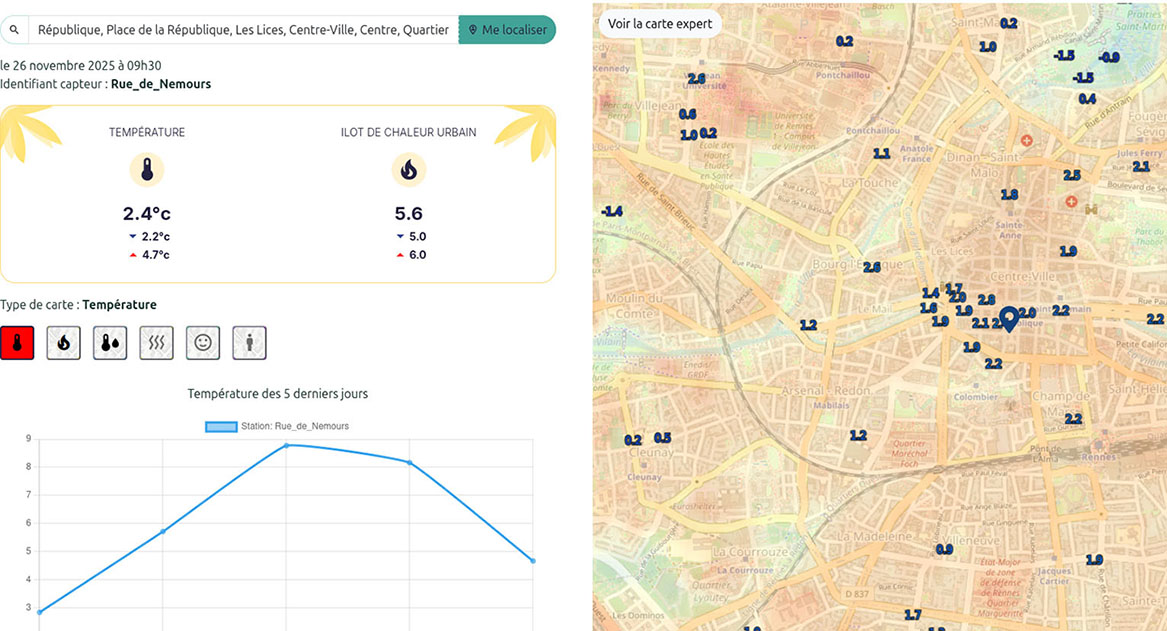 La page d’accueil, propose à chaque territoire, actuellement Rennes ou Presidente Prudente, les températures en temps réel, mises à jour toutes les 30 minutes, avec une carte de la ville permettant de se localiser. 4 modules sont disponibles : |