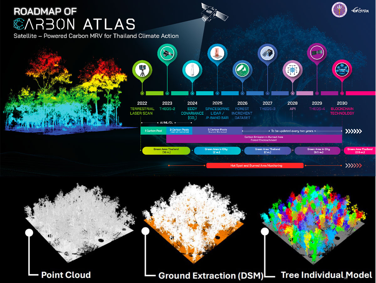 Les forêts thaïlandaises constituent des puits de carbone essentiels qui contribuent à atténuer le changement climatique. Cependant, la déforestation et la dégradation réduisent leur capacité à séquestrer efficacement le carbone. Le projet CarbonAtlas-THA améliore les systèmes de surveillance, de notification et de vérification (MRV) de la Thaïlande en intégrant des technologies géospatiales avancées, notamment la télédétection par satellite, le LiDAR et l'IA/ML, afin d'améliorer la précision des évaluations de stocks de carbone forestier.