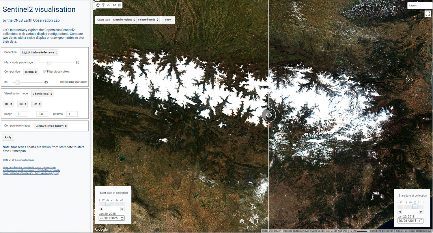 Derrière ces applis se cache une personne en particulier : Olivier Queyrut, spécialiste en traitement de données d’observation de la Terre et responsable du Lab’OT du CNES, mais aussi référent de projets SCO. Il se rappelle qu’ « en 2019/2020, Google Earth Engine offrait la promesse d’un accès facile à toute l’imagerie Sentinel-2 associé à des capacités de traitement des données et de visualisation des résultats. Tout ce qu’il faut pour montrer la Terre dans la diversité de ses paysages, au fil des saisons et la voir se transformer année après année du fait de l’activité humaine et du changement climatique. C’est ainsi qu’est née l’appli La Terre vue par Sentinel-2 ».