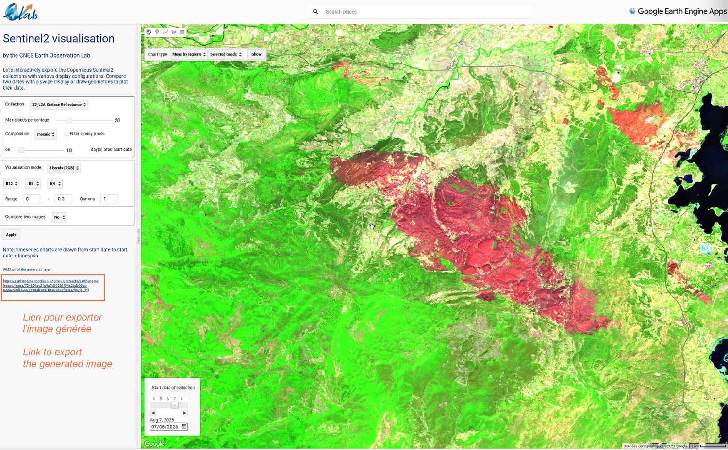 Aujourd’hui, non seulement Olivier utilise encore La terre vue par Sentinel-2, mais il l’utilise même de plus en plus : « La force de cette appli réside dans sa faculté à montrer tout ce que l’on peut faire avec l’imagerie Sentinel-2 pour observer le territoire et comprendre les phénomènes (naturels ou d’origine humaine) qui s’y produisent dans les territoires ». De fait, Olivier saisit chaque occasion, chaque remarque dans une formation pour une démonstration immédiate. « Tout récemment, j’étais avec des personnes inquiètes de l’impact des fumées sur les vignes suite aux incendies d’août 2025 dans l’Aude. J’ai pu leur montrer comment visualiser en quelques clics l’emprise de ces feux. Puis, avec un simple copier-coller du lien généré par l’appli dans QGIS, nous avons pu superposer les parcelles de vignes sur cette image » raconte Olivier. (voir images ci-dessous)