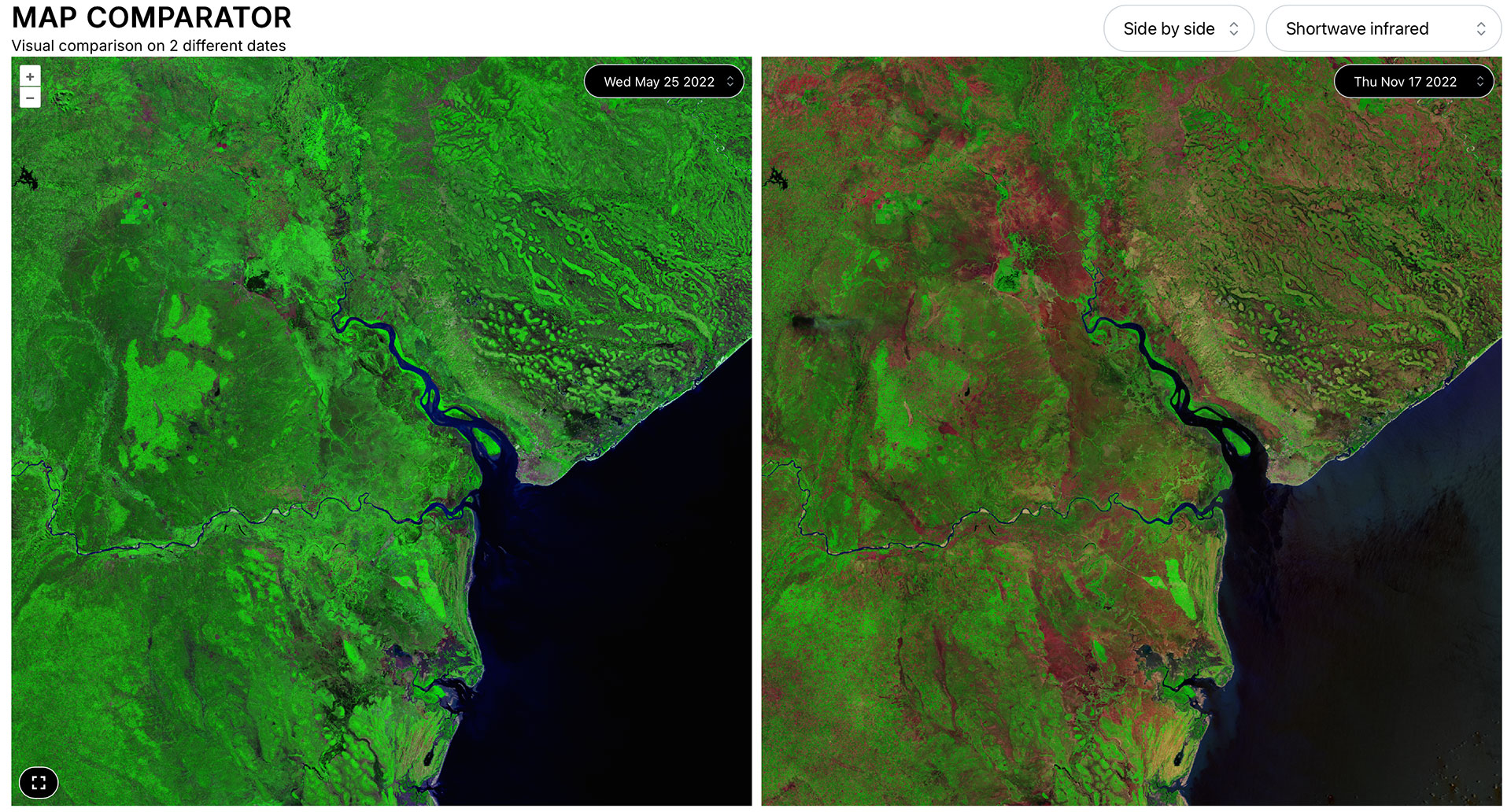 ► Comparateur de cartes montrant les traces de brûlures avant et après l'incendie de Beira au Mozambique, en mai et novembre 2022. © UNEP GRID |