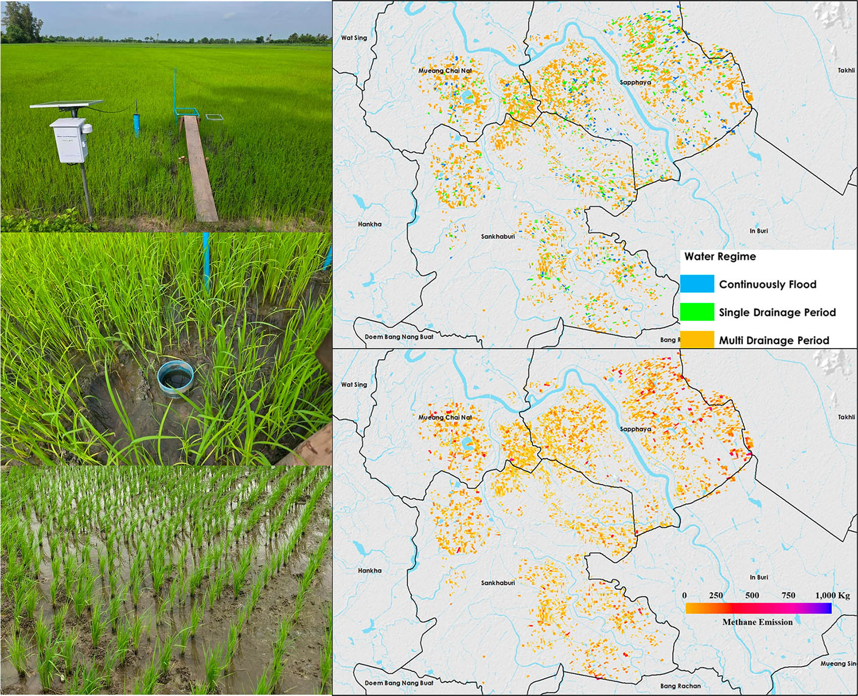 Le projet intègre des observations au sol et des données satellitaires pour surveiller le cycle d'irrigation, ce qui permet de cartographier les émissions de méthane dans l'espace et dans le temps. © GISTDA |