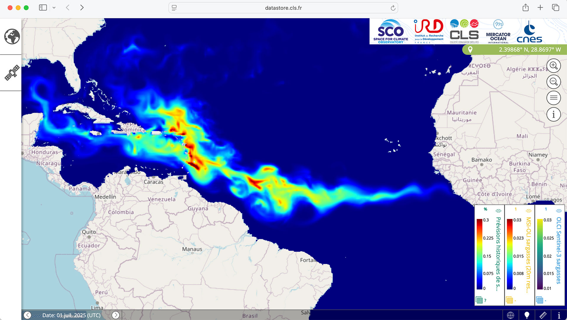 Chaque mois depuis février 2024, les indicateurs de présence de sargasses produits par CLS sont versés sur le site AVISO du pole ODATIS, où les données sont à la disposition de la communauté scientifique.
