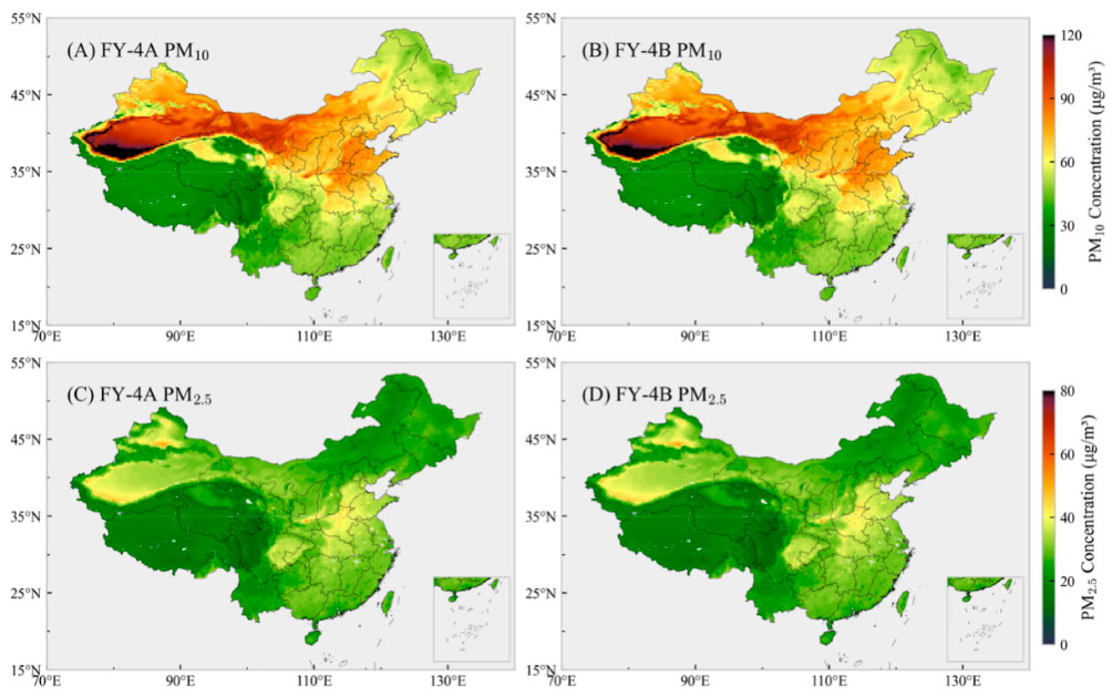 ◀︎ Annual average distribution of PM10 and PM2.5 concentrations in 2022-2023. The left and right columns show the results of FY-4A and FY-4B, respectively, proving no significant differences between the two sets of findings of these two distinct meteorological satellites. © Lanzhou University |