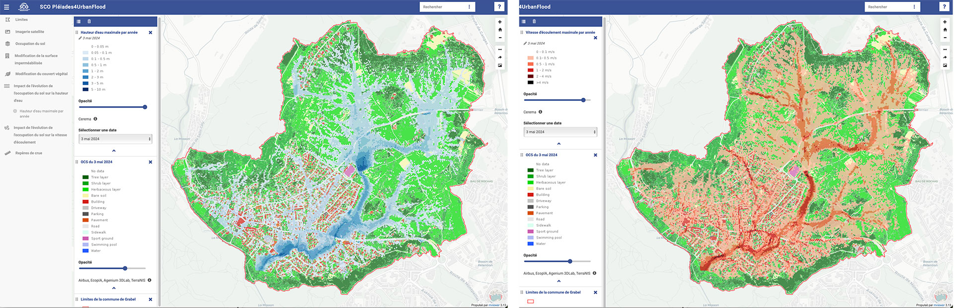 Overlay of land use in May 2024 and, by applying the hydraulic model to this map, the impact of the latter on water levels (left) and water flow velocity (right), based on the characteristics of the 2014 flash flood. © Cerema/TerraNIS