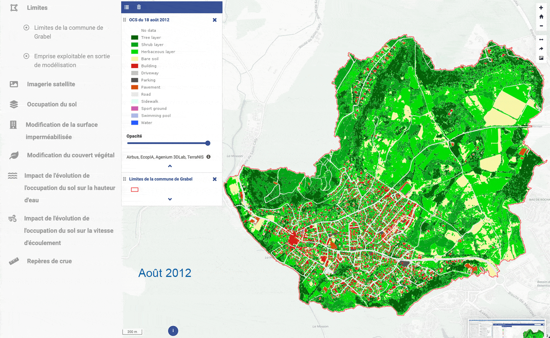 - 8 monoscopic Pléiades and Pléiades Neo (2D) images of Grabels at key dates: the "initial" situation in 2012, flooding due to the flash flood of 2014, the fire of 2017, and the situation in 2024.